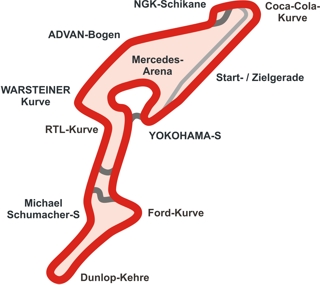 The course of the GP course can be varied by a few branches. Depending on the requirements of a race, the Omega of the Mercedes Arena can be omitted or the NGK chicane defused. The two southern straights around the Dunlop bend (also known as the Müllenbach loop) can also be connected to form an independent high-speed circuit (Circuit 3) by means of a cross-connection. Accordingly, the remaining part can also be closed with a connecting piece to an independent circuit (circuit 2).